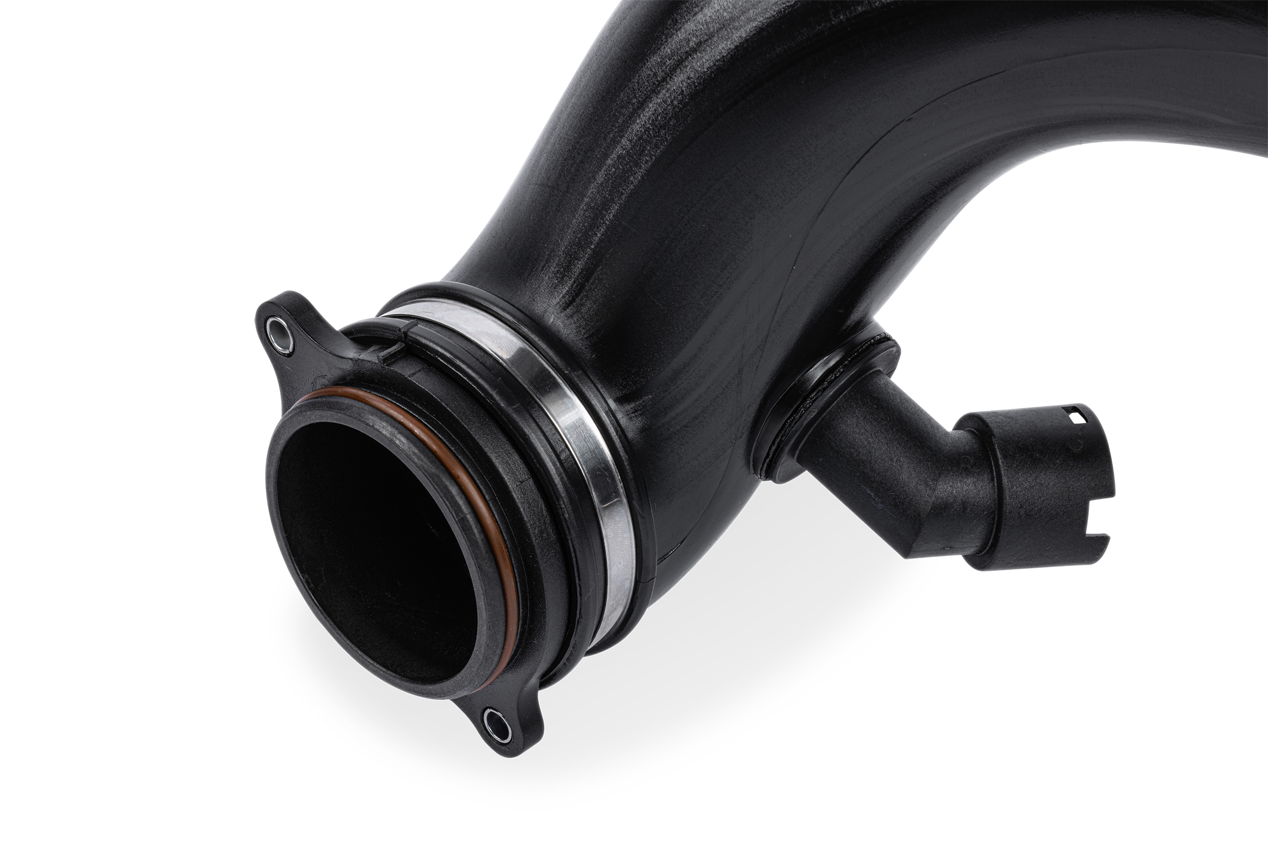So verläuft zum Beispiel der Luftweg direkt nachdem Filter in ein gerade verlaufendes Rohr ohne Kurven und Biegungen. Auch wenn es nicht in allen Situationen möglich war solche Wege zu gestalten, war es das Entwicklungsziel so gut wie möglich das perfekte Strömungsbild zu designen. Die Strömungswege wurden alle mit verschiedenen Simulationen (CFD) optimiert, um den Druckabfall und die Turbulenzen innerhalb des Systems zu minimieren. Sogar die flexiblen Abschnitte waren in den Berechnungen hinterlegt, um minimalen Unterbrechungen des Luftstroms vorbeugen zu können. Um eventuellen Turboladerumbauten vorzubeugen wurden die Rohre extra größer angepasst, um den Austausch der Turboinlet-Adaptern zu ermöglichen. Auch hier erfolgt die Installation mit einer Schelle die kein weiteres Zubehör benötigt und einen sauberen und einfachen Verbau ermöglicht. Im Gegensatz zu den werksseitigen Einlassrohren wurde darauf geachtet keine scharfen oder störenden Biegungen vor dem Turbolader entstehen zu lassen.